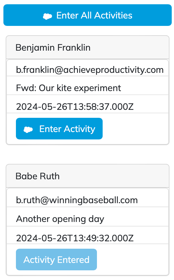 Click to queue the emails you want to enter into the proper Salesforce Contact or Lead record; then click [Enter All Activities]. That’s it!